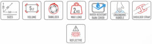 - Poliéster 600D y Poliéster laminado PU.